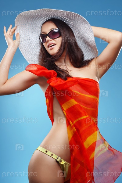 Красивая молодая женщина в одежде для пляжа на голубом фоне