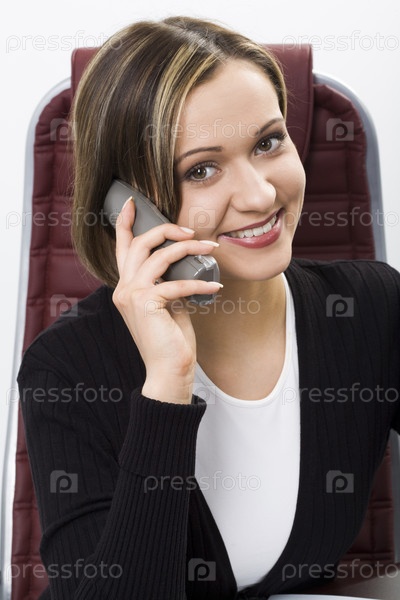 Улыбающаяся красивая брюнетка-бизнесменка, разговаривающая у своего телефона