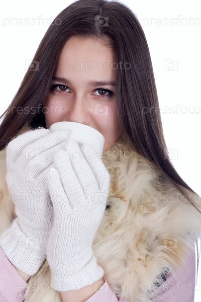 Женщина в перчатках с кружкой чая на белом фоне