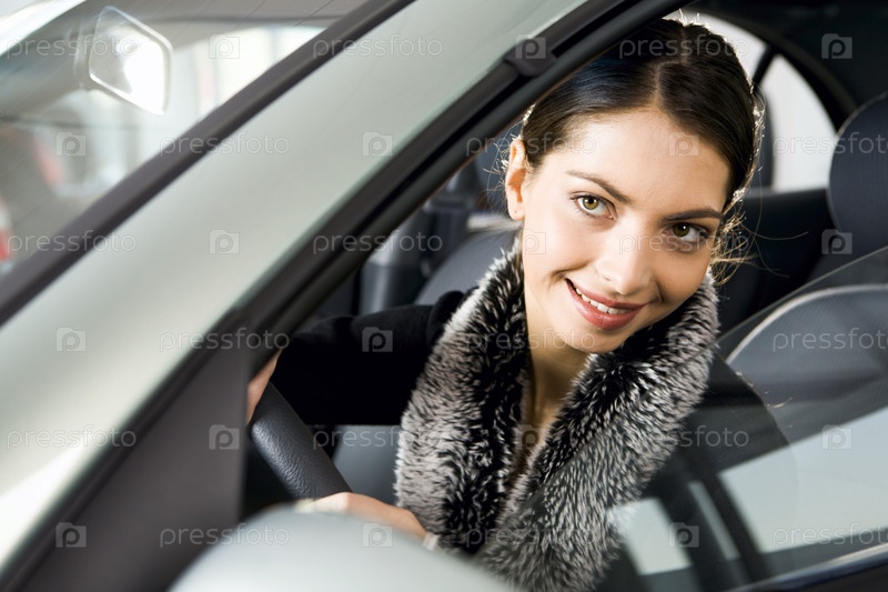Портрет яркой брюнетки, которая с интересом смотрит в окно своей машины