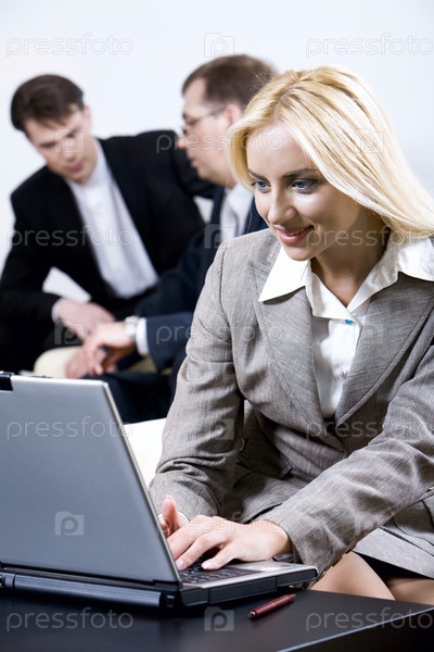 Портрет блондинки-бизнесменки, печатающей на ноутбуке два говорящих бизнесмена сидят на диване на заднем плане