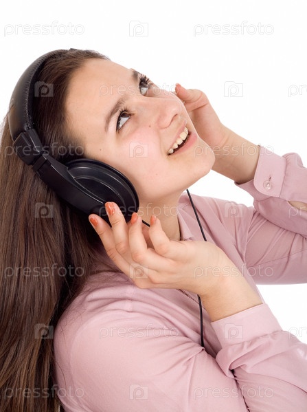 Девочка слушает музыку в наушниках, изолированная на белом фоне