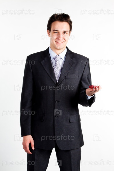 Страховой агент с игрушечной машинкой стоит на белом фоне
