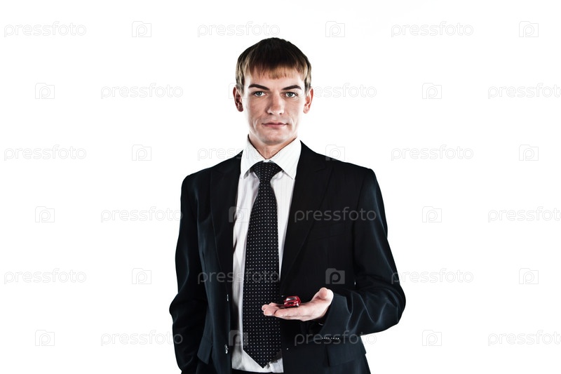 Страховой агент с игрушечной машинкой на белом фоне