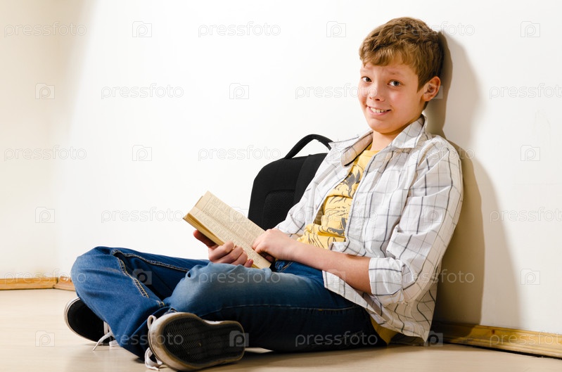 Подросток читает книгу, сидя на полу
