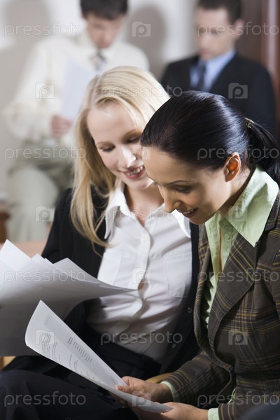 Две красивые женщины читают записки и два мужчины на заднем плане