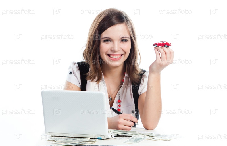 Улыбающаяся симпатичная бизнес-леди с машинкой за ноутбуком на белом фоне