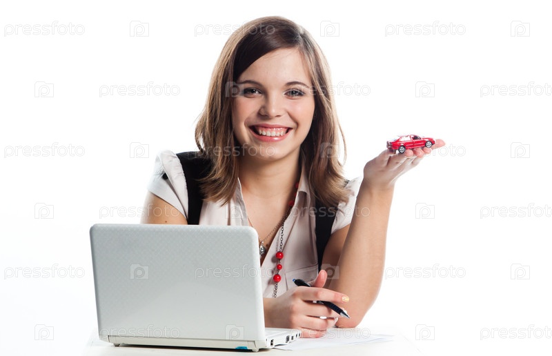 Молодая симпатичная бизнес-леди с машинкой за ноутбуком на белом фоне