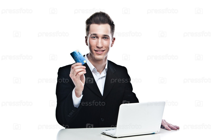 Молодой бизнесмен с кредиткой за ноутбуком на белом фоне