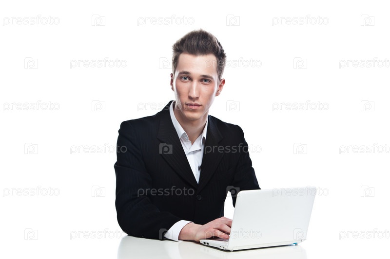 Молодой бизнесмен с ноутбуком на белом фоне