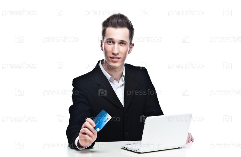 Молодой бизнесмен с кредиткой за ноутбуком на белом фоне