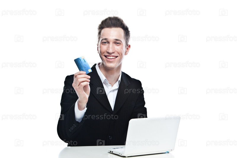 Счастливый молодой бизнесмен с кредиткой за ноутбуком на белом фоне