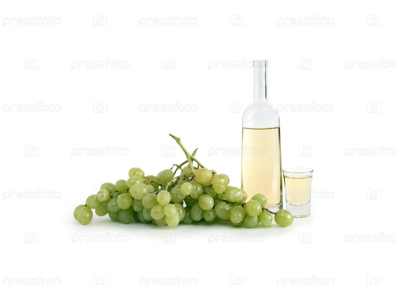 Бутылка вина и виноград на белом фоне