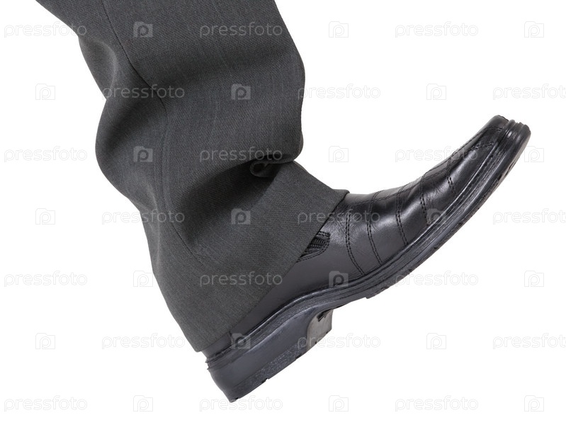 Нога человека в черном костюме, готовый раздавить, выделенные на белом