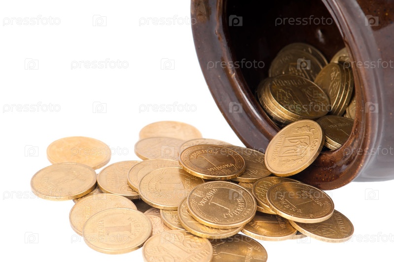 Монеты в горшке крупным планом на белом фоне