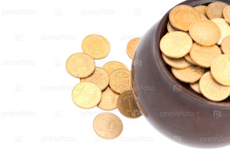 Монеты в горшке крупным планом на белом фоне