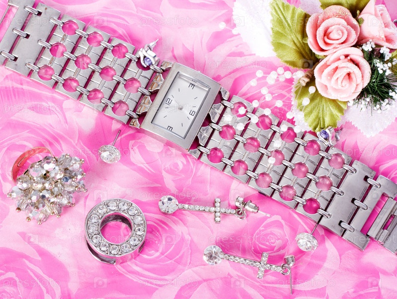 Ювелирные украшения и часы на розовом фоне