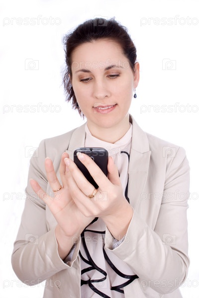 Красивая брюнетка набирает номер на мобильном телефоне