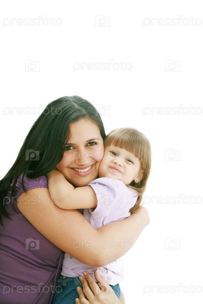 Мать обнимает дочь на белом фоне