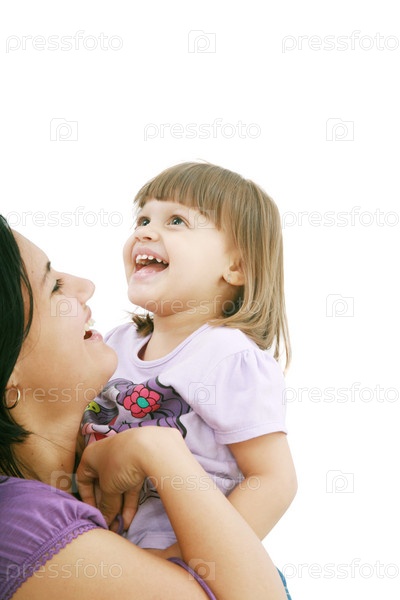 Мать держит дочь на белом фоне