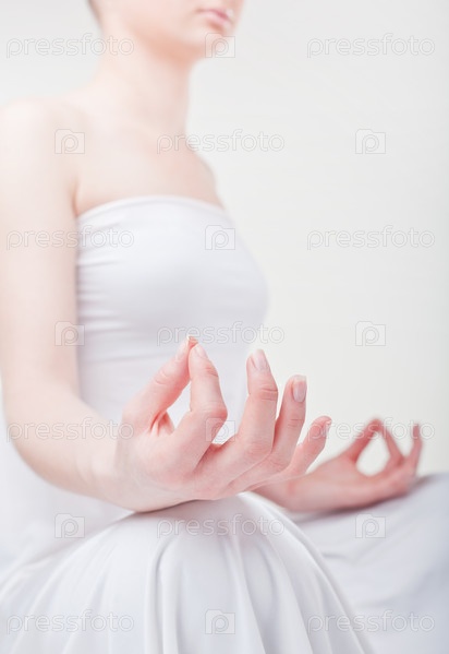 Женщина занимается йогой на светлом фоне