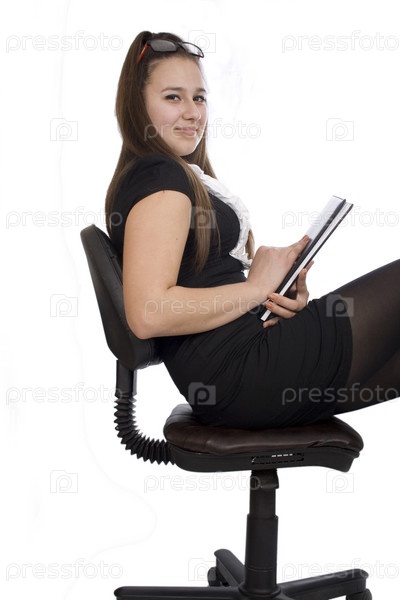 Женщина-секретарь сидит в офисном кресле с документами на белом фоне