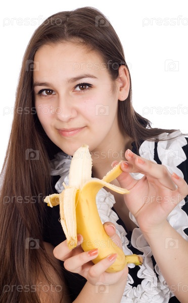 Юная брюнетка чистит банан на белом фоне