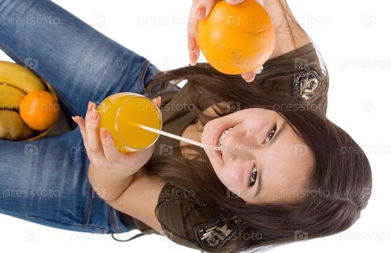 Девушка с апельсиновым соком и фруктами на белом фоне