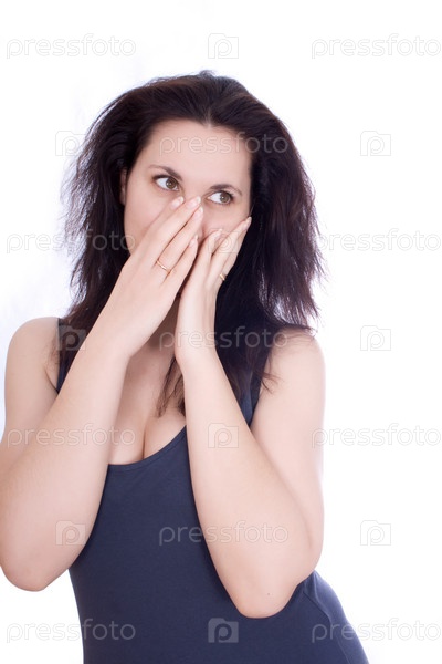 Портрет молодой женщины, закрывающей лицо руками на белом фоне