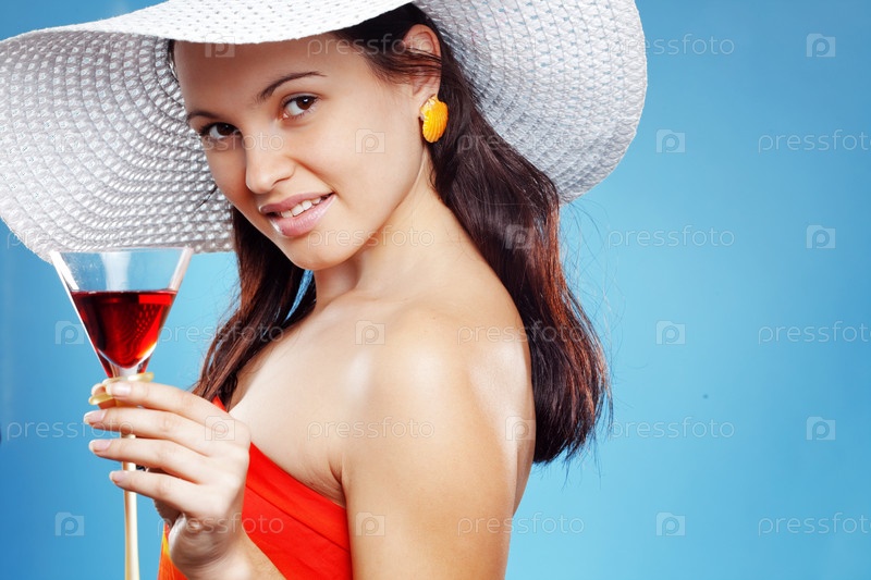 Молодая красивая женщина в шляпе и с коктейлем на голубом фоне