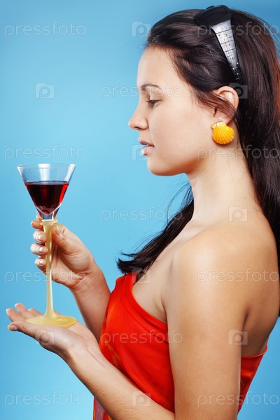 Молодая красивая женщин с коктейлем на голубом фоне