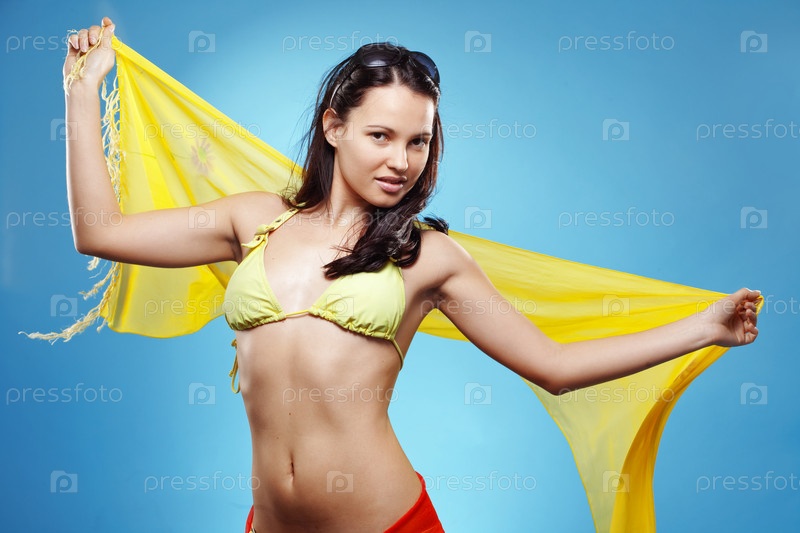 Молодая красивая женщина в купальнике на голубом фоне