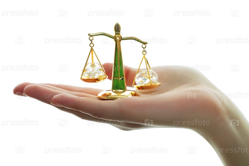 Декоративные весы в руке на белом фоне