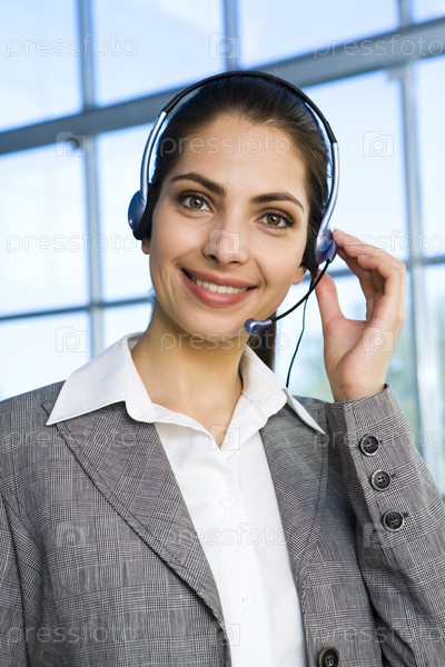 Портрет красивой улыбающейся брюнетки в сером костюме, прикасающейся к гарнитуре на голове и небоскребу с стеклянными стенами на фоне