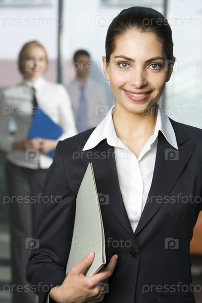 Портрет красивой улыбающейся брюнетки, смотрящей на камеру в офисе со светофором с большими окнами и двумя бизнесменами на заднем плане