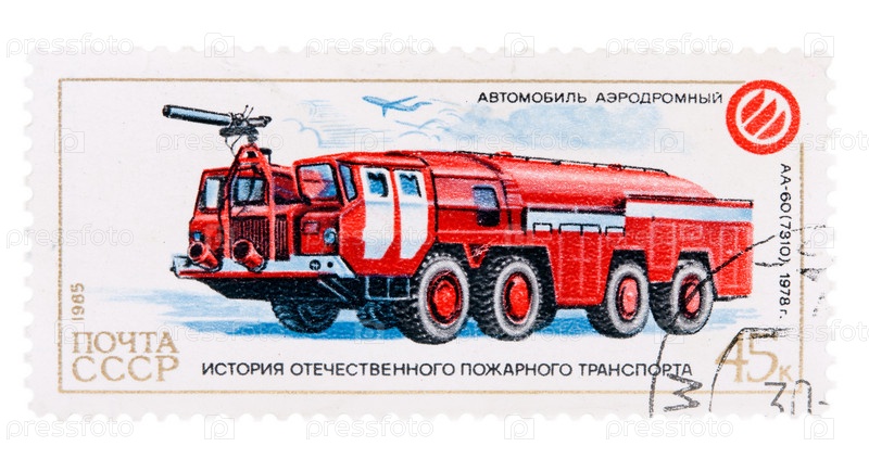 Почтовая марка СССР 1985 года с изображением аэродромного пожарного автомобиля