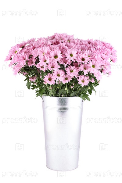 Хризантемы в ведре на белом фоне