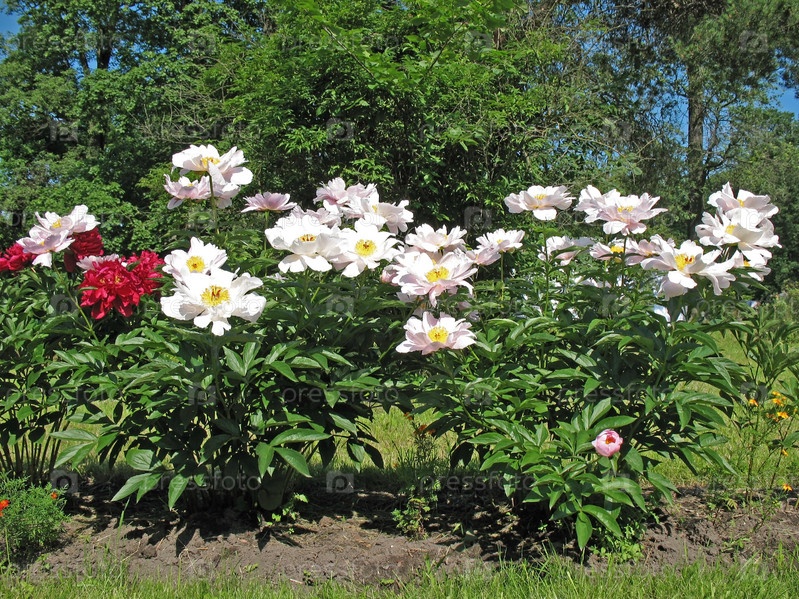 Обильное цветение гибридного пиона (Paeonia), семейства Пионные