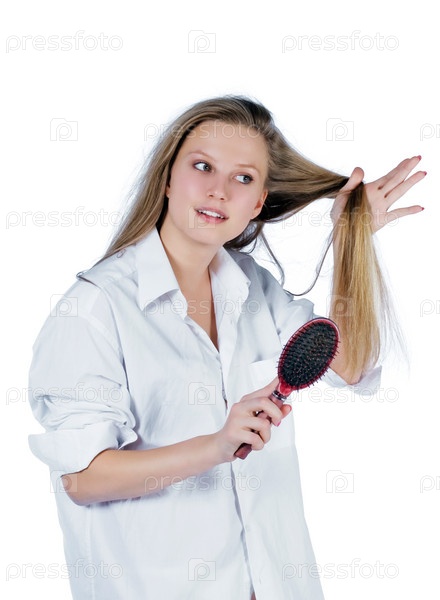 Портрет молодой женщины в белой рубашке, расчесывающей волосы. белый фон