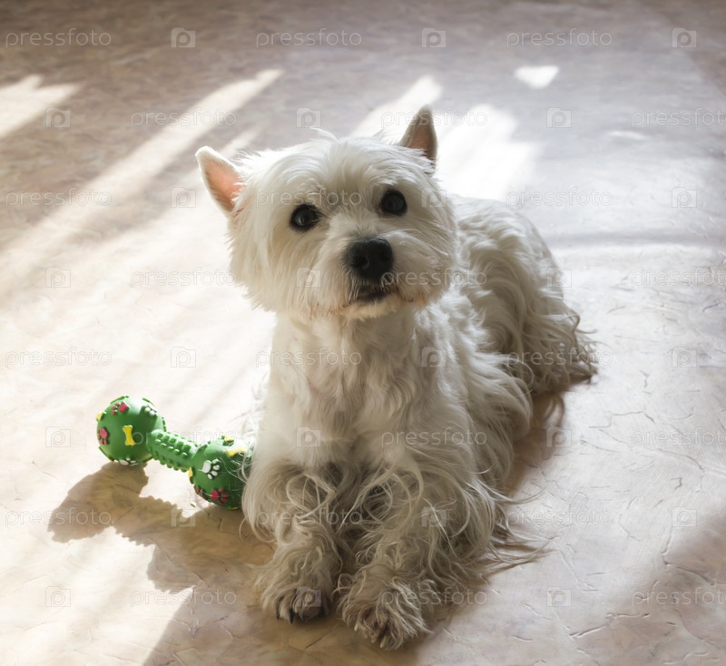 Собака породы Вест-Гайленд-Тепьеп лежит на полу