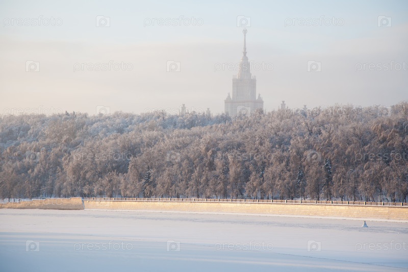 Зимний вид на Лужнецкую набережную Москвы-реки и МГУ