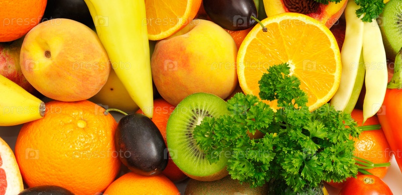 Свежие фрукты и овощи на белом фоне