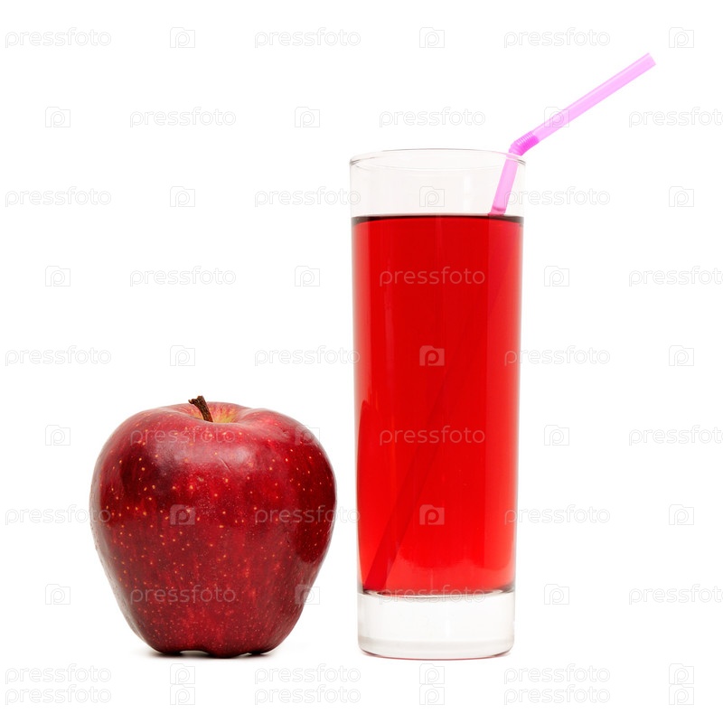 Стакан сока и яблоко на белом фоне
