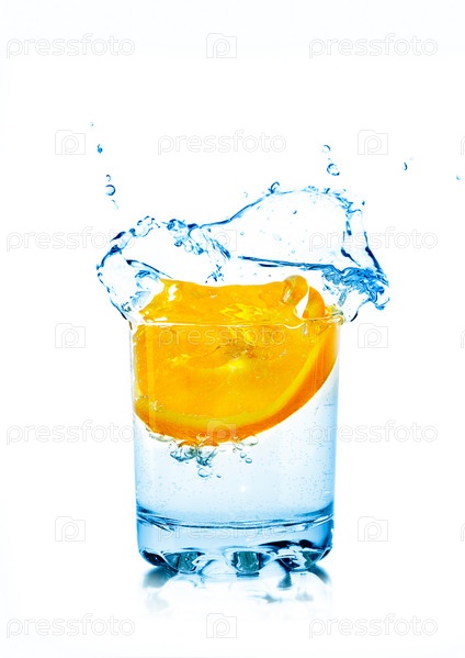 Апельсин падает в стакан с водой