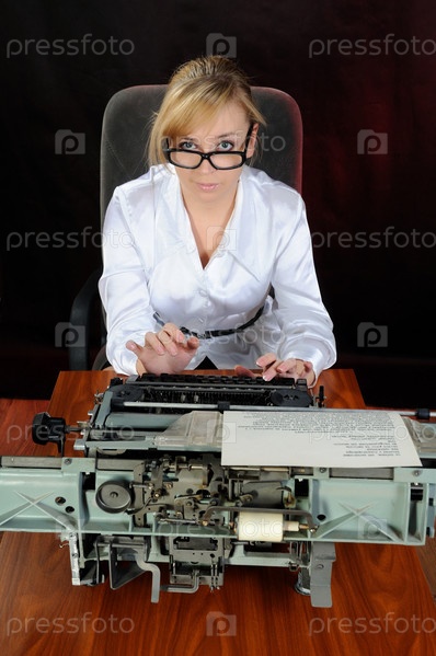 Секретарь печатает на старой пишущей машинке на темном фоне