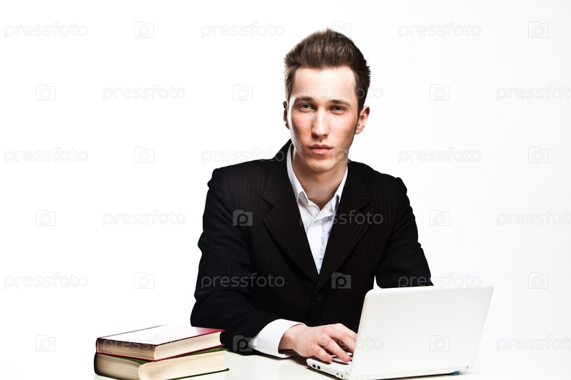 Портрет молодого симпатичного мужчины в строгом деловом костюме, который сидит за столом и работает за ноутбуком