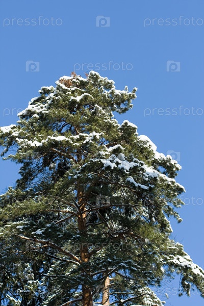 Сосна, припорошенная снегом, на фоне яркого голубого неба