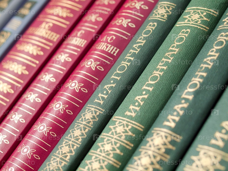 Собрания сочинений Пушкина и Гоголя на полке книжного стеллажа