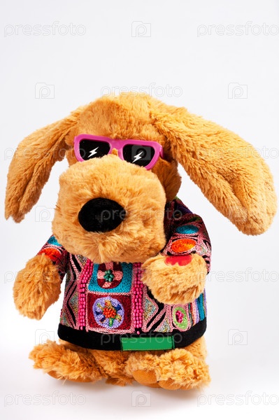 Мягкая игрушка собака в костюме и очках на белом фоне