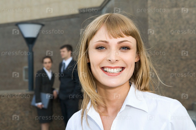 Портрет красивой улыбающейся блондинки в белой блузке и двух молодых бизнесменов на фоне архитектуры